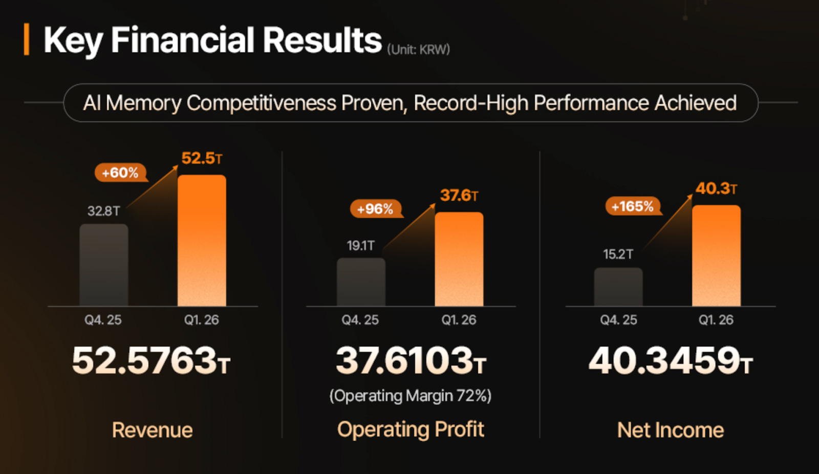 These numbers are wild. The company posted $35.55 billion in revenue for Q1 2026. That’s the highest for any single quarter in its history and a staggering increase of nearly 3X year-on-year. SK Hynix also saw operating profit increase five-fold to reach $27.9 billion. Operating margin hit a new record of 72%.