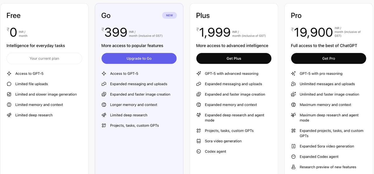 While ChatGPT Go is cheap, it isn’t aimed at cannibalising its existing plans. The new package offers ten times more messages and image generation prompts than the free version, not to mention faster responses, but it will also be aimed at becoming a gateway to more expensive plans. Its mid-range offering is 1,999 INR per month, or $22.80.
