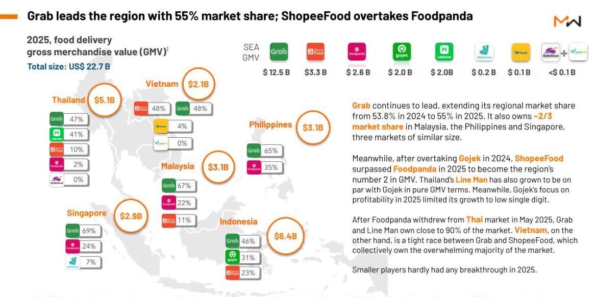 Grab continues to be the food delivery service of choice for Southeast Asia with the Singapore-based company now commanding 55% of the regional market, according to a report from Momentum Works. FoodPanda conceded the most ground, and it could fall further behind after it withdrew from Thailand, which was Southeast Asia’s fastest growing market.