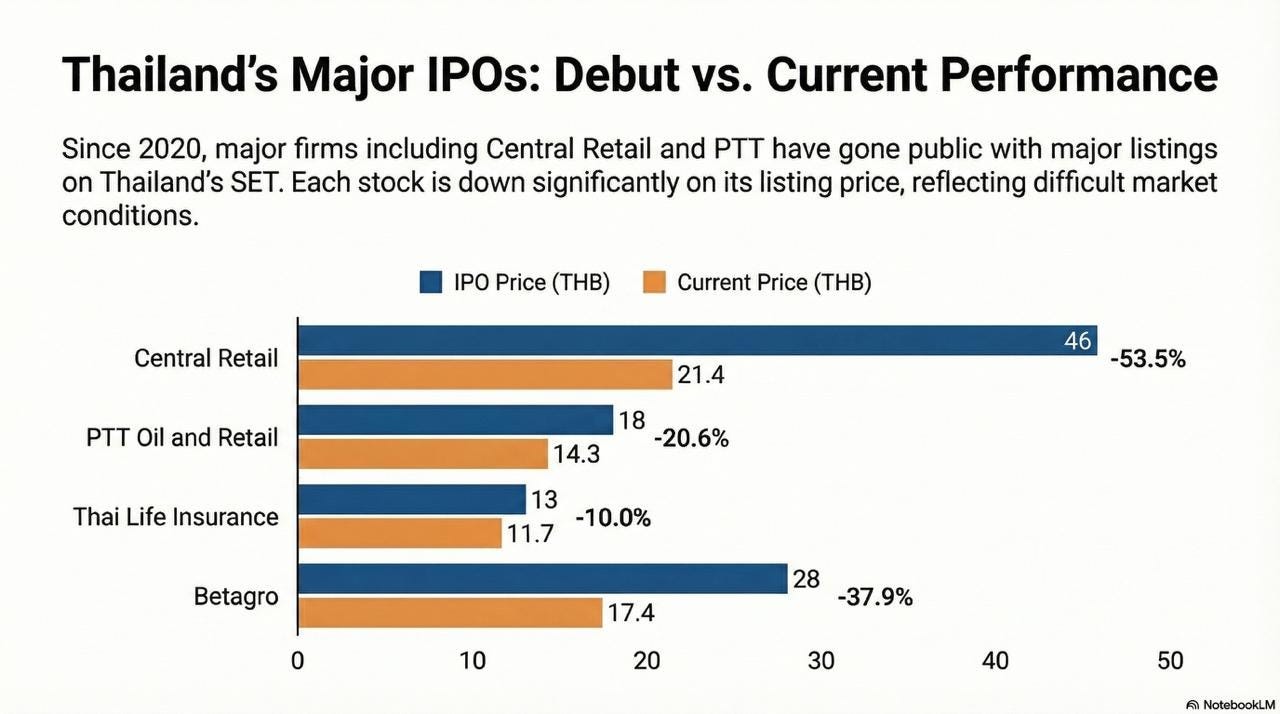 The CRC share price is down 54% on its listing price. It isn’t an isolated case. Significant floats from food producer Betagro, oil major PTT and Thai Life Insurance all remain underwater, reflecting the overall struggles of Thailand’s public markets.